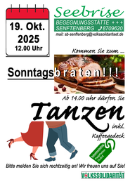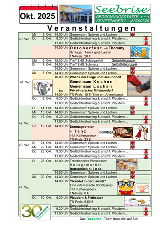 Natürlich dreht sich nicht alles nur ums Essen. Es gibt vielfältige regelmäßige Angebote. Außerdem finden monatlich wechselnde Veranstaltungen statt, die mit Ideenreichtum vom Team der "Seebrise" organisiert werden und bei denen sicher für jeden etwas dabei ist. Wir freuen uns immer über eine rege Teilnahme.