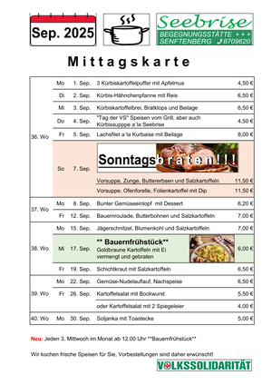 Zum gemeinsamen Mittagstisch werden leckere und kostengünstige Menüs zubereitet. Der aktuelle monatliche Plan kann hier angesehen und heruntergeladen werden.